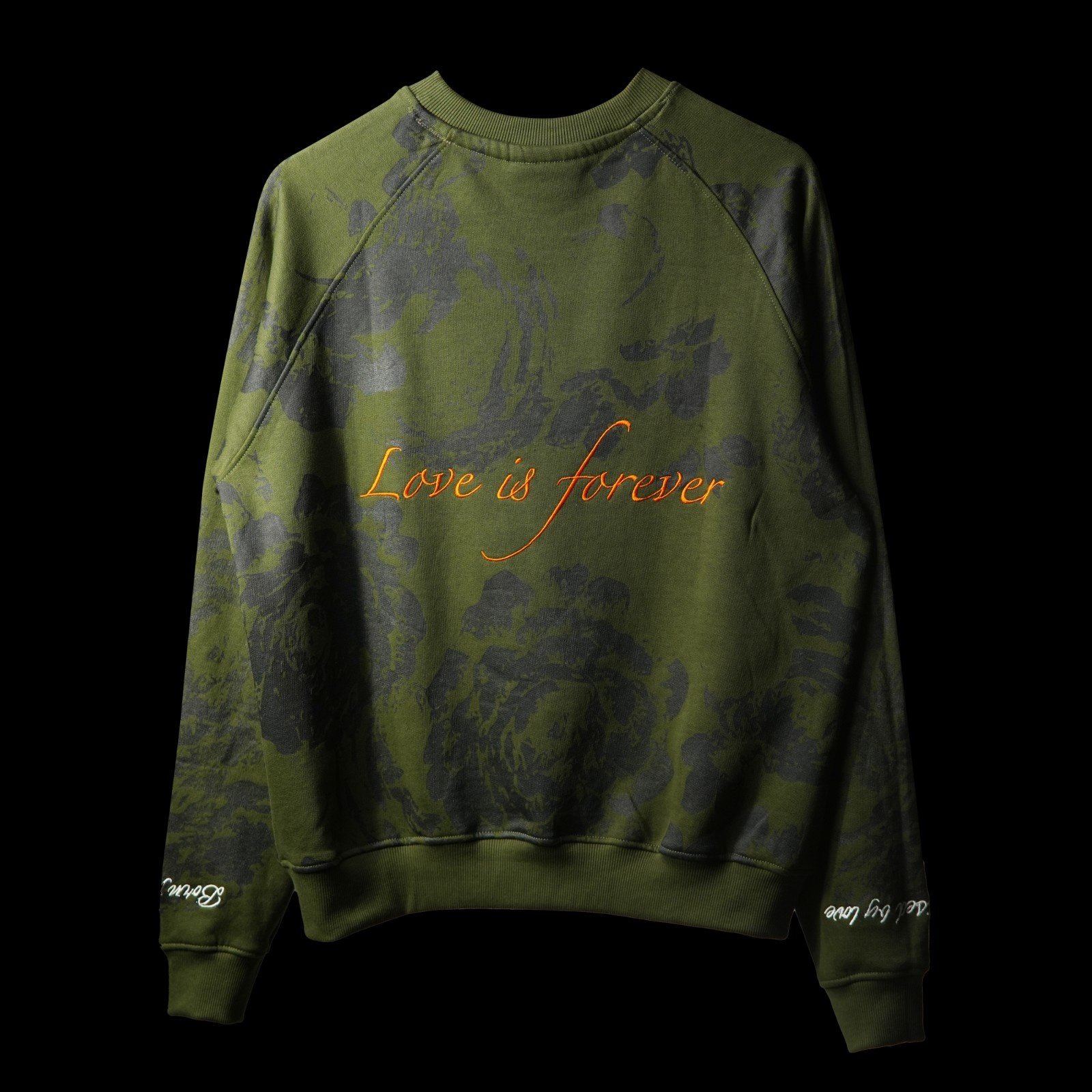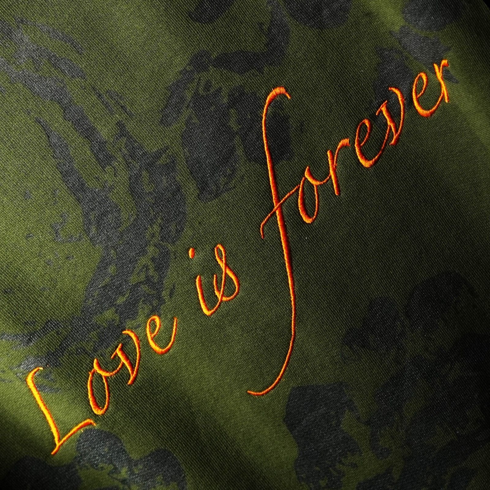 The “Love Is Forever” sweat shirt blends bold floral prints with a timeless message. Crafted in deep black with subtle rose patterns and vibrant lettering — a perfect mix of style, emotion, and street vibe.